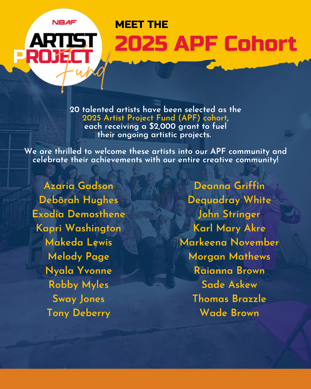 The NBAF Artist Project Fund (APF) is a $2000 award and artistic development program for Metro Atlanta artists seeking funds to complete an ongoing project.