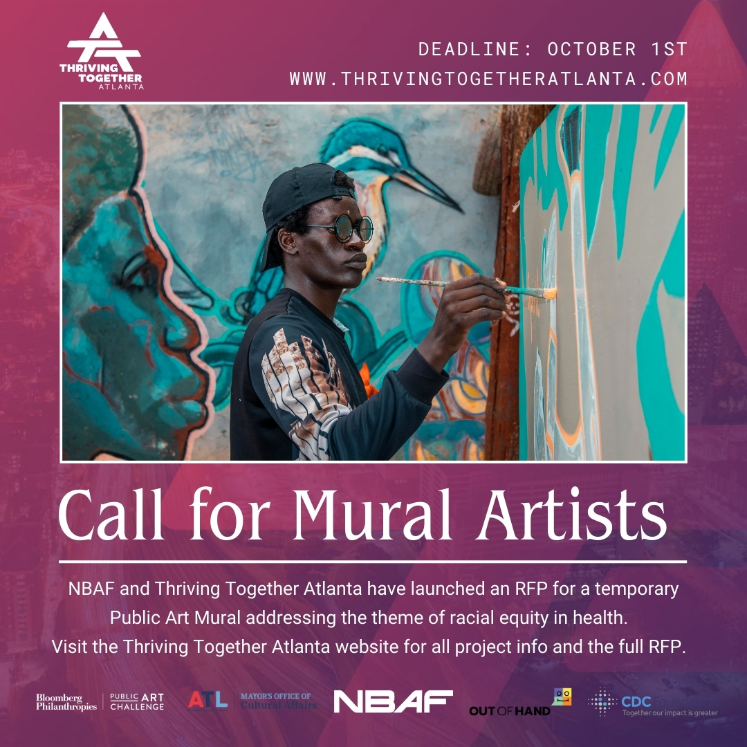 ATLANTA – Thriving Together Atlanta, a transformative public art initiative between the City of Atlanta – Mayor’s Office of Cultural Affairs, the CDC Foundation, National Black Arts Festival, and Out of Hand Theater, is proud to announce the temporary public art mural RFP. Individual artists and artist teams are encouraged to submit their proposals for the public art mural dedicated to promoting racial equity through powerful visuals and community engagement.